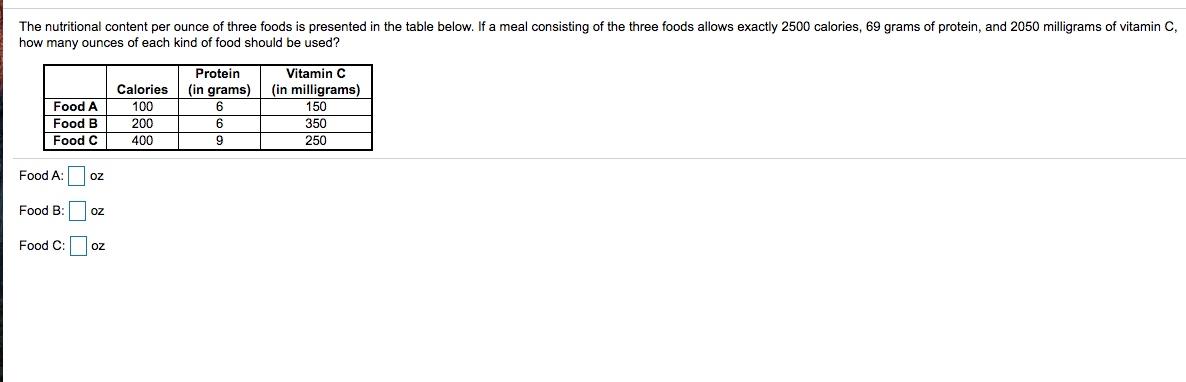 Solved The Nutritional Content Per Ounce Of Three Foods Is Chegg Com